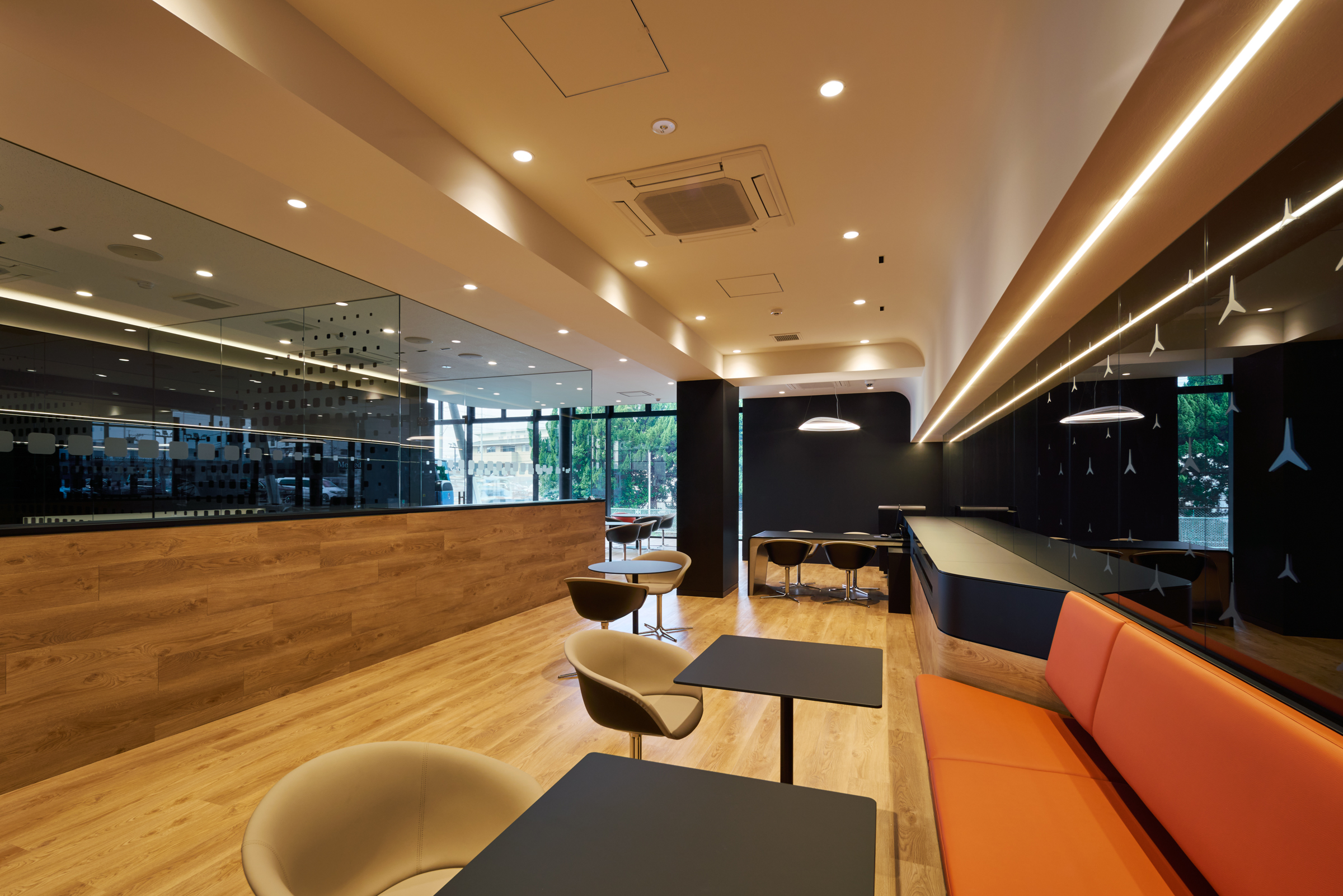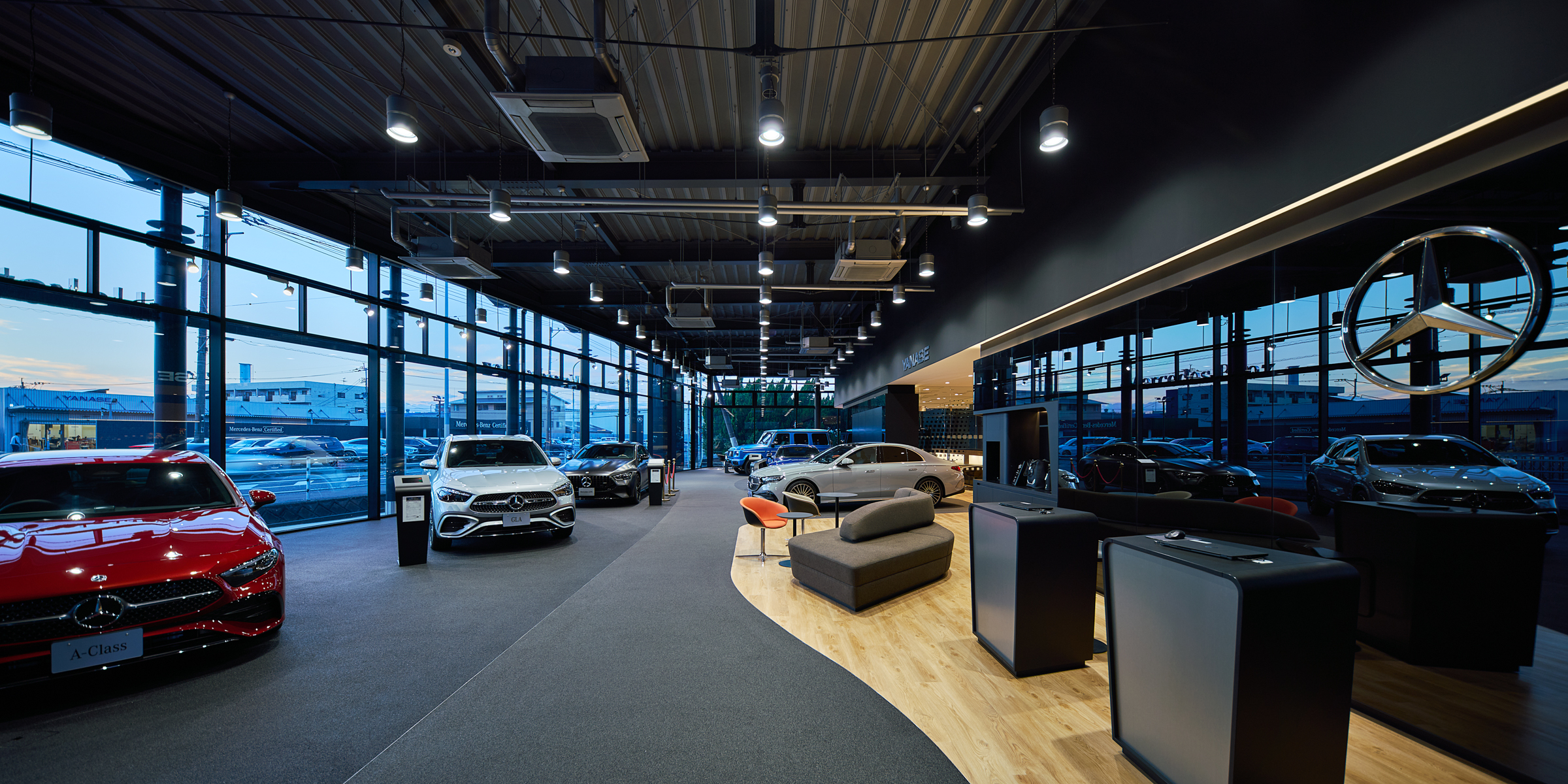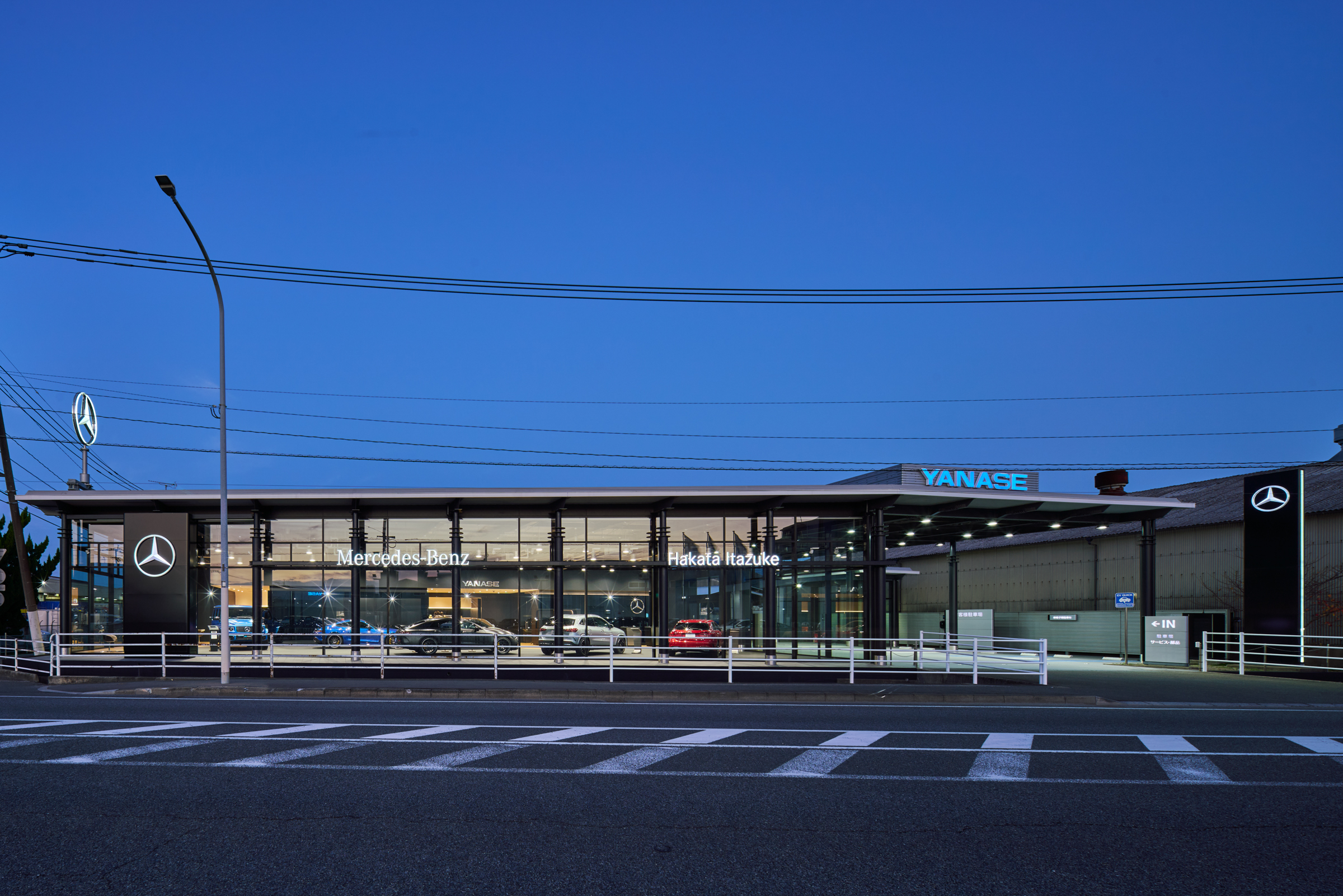 メルセデスベンツ博多板付 2025年12月12日 Summary 竣工 2025年10月 計画地 福岡県福岡市博多区井相田 計画種別 改修 用途 自動車ショールーム 構造 / 階数 鉄骨造/地上2階 敷地面積 3302.76㎡ 延床面積 2313.98㎡ 業務 基本設計&デザイン監修&CI監理 設計施工 株式会社イチケン 撮影 黒岩翼